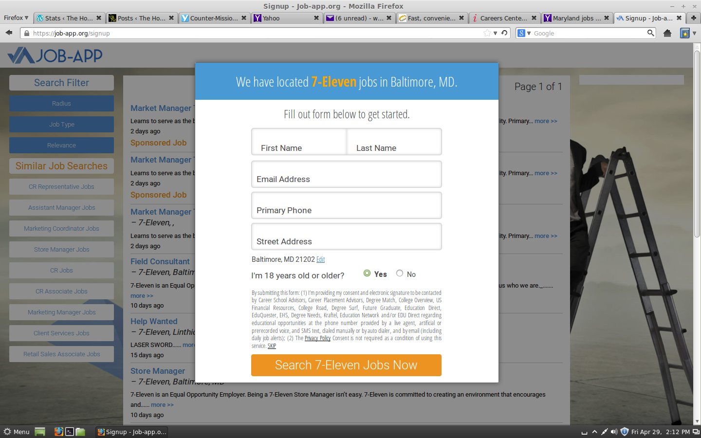 | I will need to assemble a list of the stores and then apply to each one in person. The online portal at 7-eleven.com somehow does not include any jobs in Maryland. A Yahoo! search on “7-Eleven jobs Maryland” came up with a number of job search pages that advertise they’ve got such jobs, but (1) a few screen shots I saved indicate some of these are fronts for other activity, several of them even put up by the same vendor, and (2) as for non-managerial positions, they don’t. |