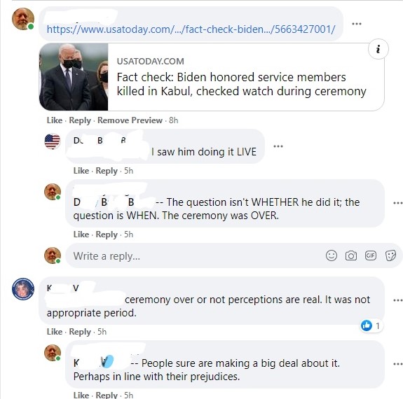 Here are the comments on DBB’s post. I am the handsome guy with the beard. I posted this link: “Fact check: Biden honored service members killed in Kabul, checked watch during ceremony.”