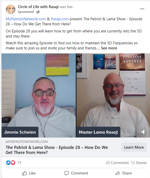 So, Rasaji had this ad this morning, image above, saying their podcast Episode 28 tells how to get to 5D (the fifth dimension) and stay there. Not exactly the subject matter I’d expect from a Patriot and a lama.