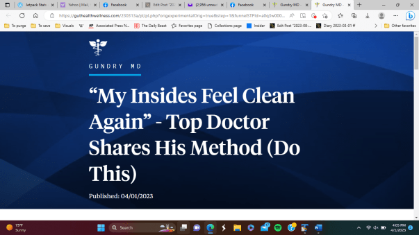 This always leads to a page where the images and text have no relation to the original image. (Note from the images above, that he has a multiplicity of web sites.) There follows an interminable video, that in Dr. Gundry’s case will wander from subject to subject to subject that have no relation to each other; and presumably ends up with the sales pitch for his supplements.