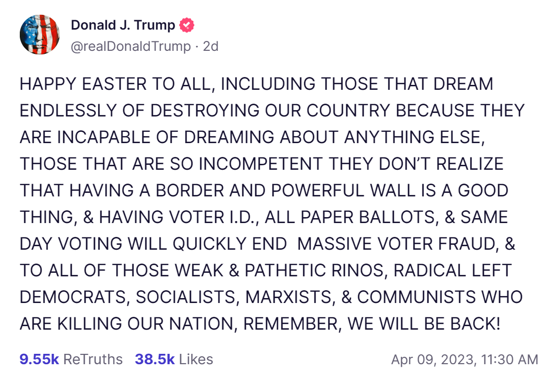 In his Easter 2023 message, Donald Trump ratchets up the hate.